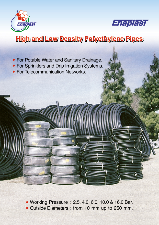 ENAPLAST manufactures Polyethylene Pipes and Fittings from High Density Polyethylene (HDPE), Linear Low Density Polyethylene (LLDPE) and Low Density Polyethylene (LDPE) in diameters from 4 mm to 110 mm. larger diameters could be produced upon request. All products are stabilized against UV rays using Carbon Black in order to increase their Environmental Stress Cracking Resistance (ESCR). |