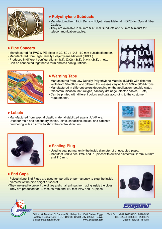 ENAPLAST is one of the leading pioneer companies in Egypt, manufacturing Plastic Piping Systems for Potable Water, Sanitary Drainage, Irrigation, and Telecommunication since 1988, in Sadat City, Egypt. These products are produced in two (2) different factories as follows: