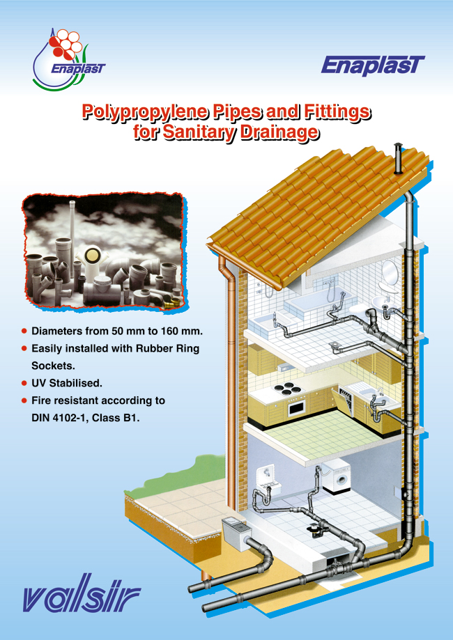 ENAPLAST is producing Polypropylene (PP) Pipes in collaboration with Valsir - Italy. The system is produced from a grey self-extinguishing polypropylene material which allows the fire to be self-extinguished within less than 12 seconds, according to DIN 4102-class B1. Dimensions vary between 50mm to 160mm.
